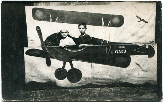 Descriere: fotografie de bâlci, doi copii în avion;