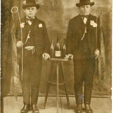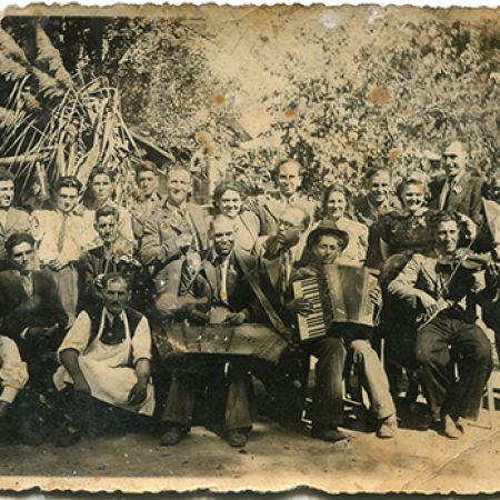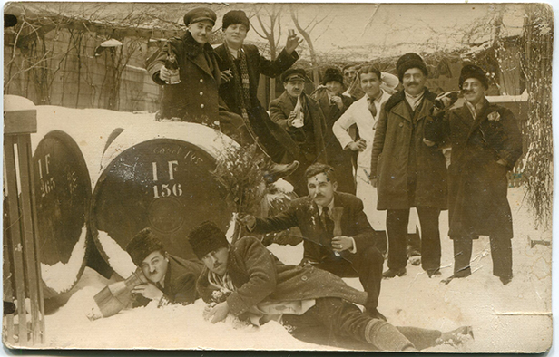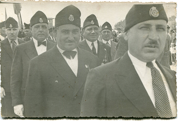 Titlu: Grup de bărbați fotografiați la bâlci Atelie: necunoscut; Datare: 1935-1945; Dimensiuni: 13,5 x 8,5 cm; Tehnică: pozitiv pe hârtie cu gelatino–bromură de argint; Descriere: șase domni cu pălării. Cinci dintre ei țin mânușile în mână, î