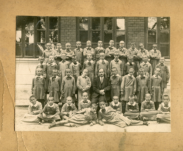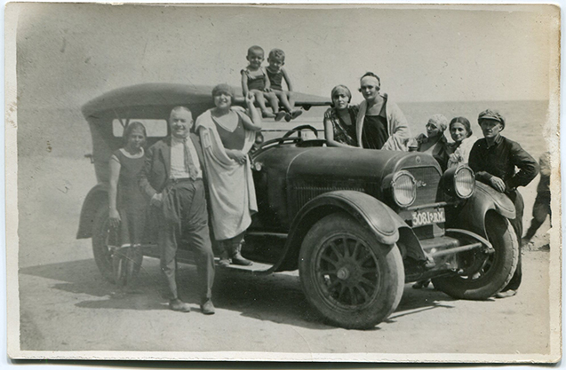 Descriere: fotografie de exterior, 13 fetițe în uniforme școlare, pe mașină (pare un Ford anii '20. poartă inițialele SVP, și numărul de înmatriculare 16.266-B);