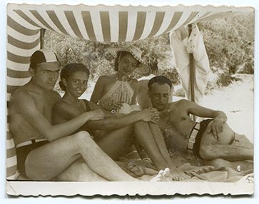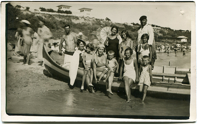 Descriere: grup pe plajă, lângă o barcă, pe plaja stațiunii Carmen Sylva Movilă (Eforie Sud). În fundal, pe faleză, se vede Cazinoul Movilă, inaugurat în 1934;