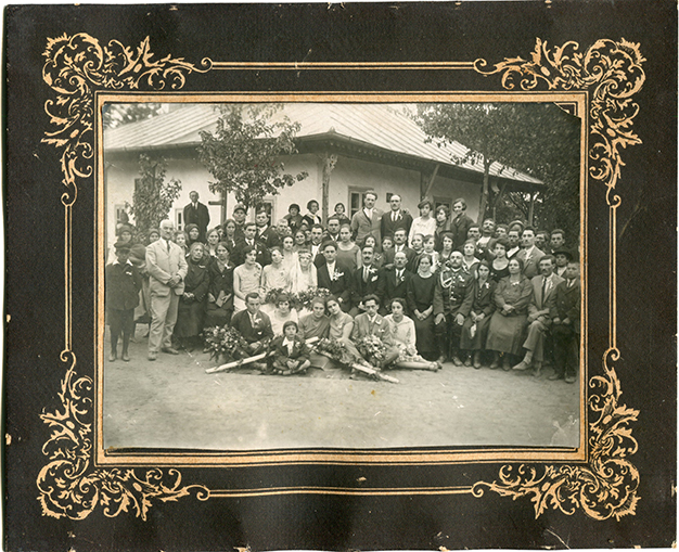 Tehnică: fotografie de grup, de nuntă. În fața casei un grup format din 66 de persoane;