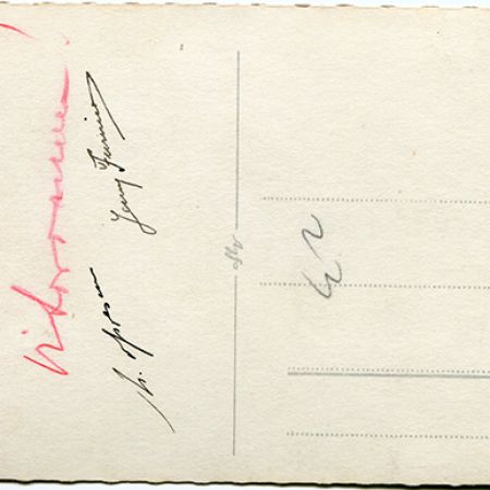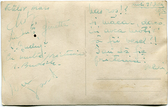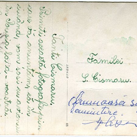 Însemnări: ’’Tanti Cismaru. Primiți această fotografie prin care vă anunțăm, că în curând, vom sosi cu avionul în Rusia la d-voastră. Sărutări de mâini de la mine și Rică. Vă sărutăm Silvia și Rică. Frumoasă și plăcută amintire’’;
