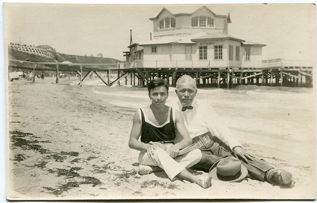 Descriere: tânăr cu cartea și bărbatul mai în vârstă pozează pe plajă; În fundal vedem Cazinoul Neptun, primul cazino de la Băile Movilă Carmen Sylva construit în 1925 și abandonat în 1929, dărmat în 1931;