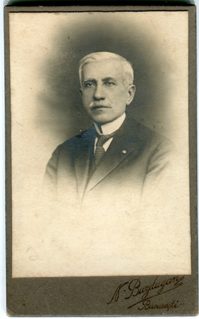 Descriere: fotografie de studio, portret de bărbat cu mustață;
