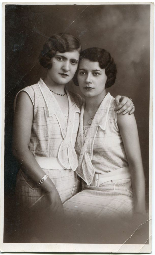 Descriere: fotografie de studio, două tinere îmbrăcate identic;