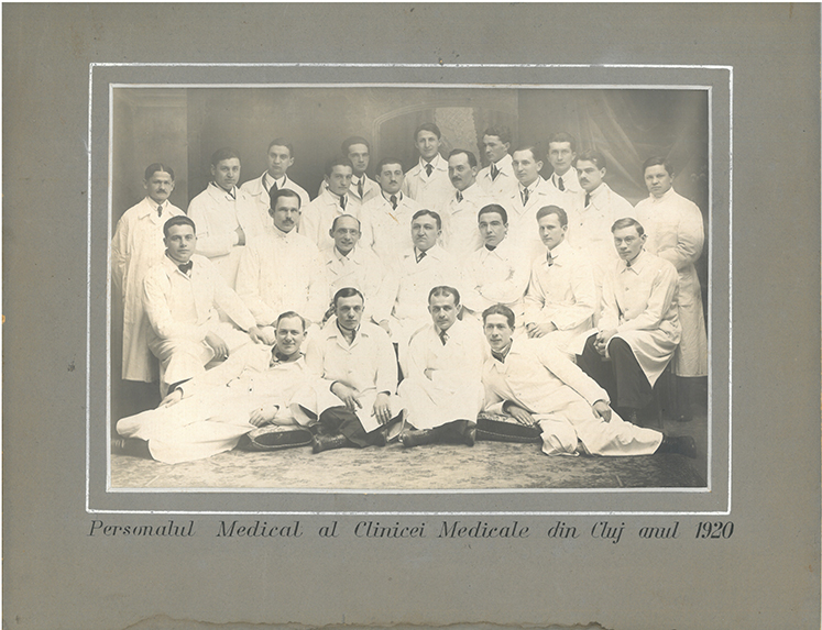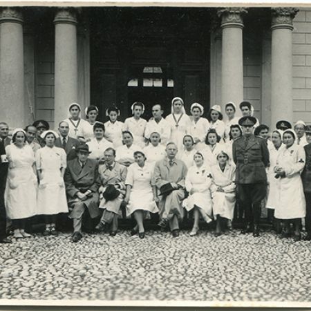 Titlu: Grup de doctori și sore medicale în fața spitalului din Câmpulung Muscel 14, Sept. 1941;