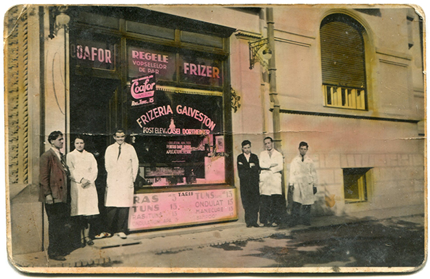 Descriere: fotografie de exterior, Frizeria Galveston- angajații în fața frizeriei. Pe vitrină putem citi: „Regele vopselelor de păr. Coafor, Frizerie Dame, Domni. Frizeria Galveston, fost elev al Casei Dortheinner. Ondulațiuni apă, fier, aplicațiune Henne. Tarif lei: Ras Tuns 15, ondulațiuni apă 5, tuns dame 15, ondulat 15, manecure 15, Sampoo 15”.