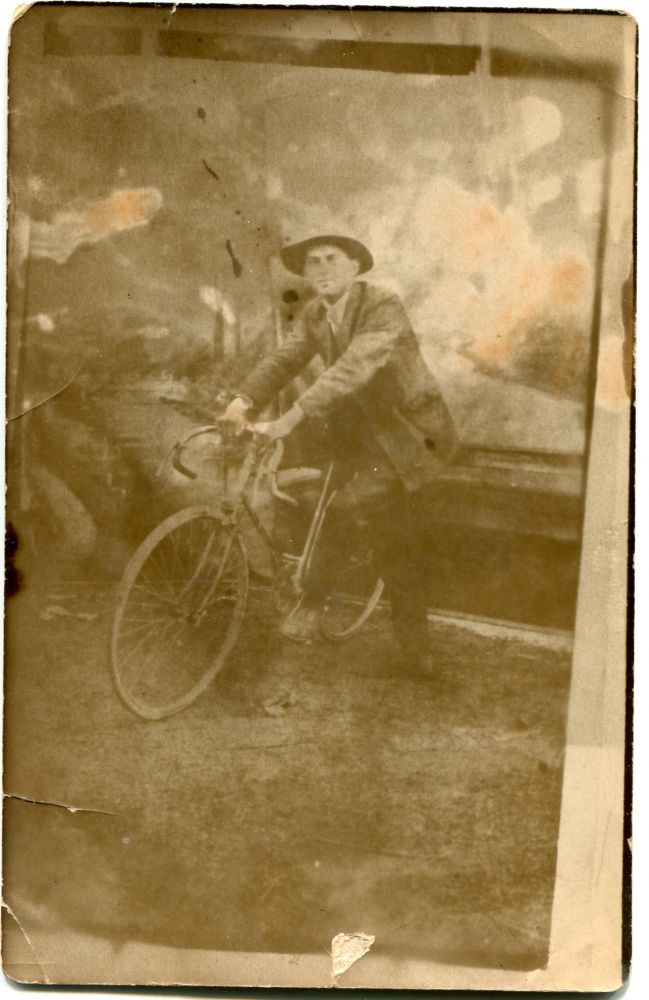 Titlu: Tânăr cu bicicleta, lângă o pompă de benzină Unirea