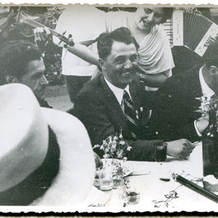 Descriere: fotografie de exterior, petrecăreți cu lăutari, la o terasă de restaurant;