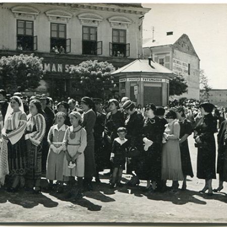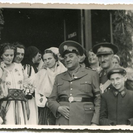 Descriere: fotografie de exterior, militari și femei îmbrăcate în port popular pe stradă, probabil la o sărbătoare a orașului Tg Jiu;