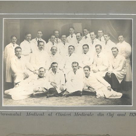 Descriere: fotografie de exterior, grup de doctori și sore medicale în fața spitalului din Câmpulung Muscel;