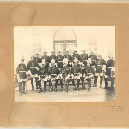Descriere: fotografie de exterior, cu Garda Regală, instituită de regele Carol al II-lea în 1930. Prima defilare în frumoasele uniforme a fost la 10 mai 1931;